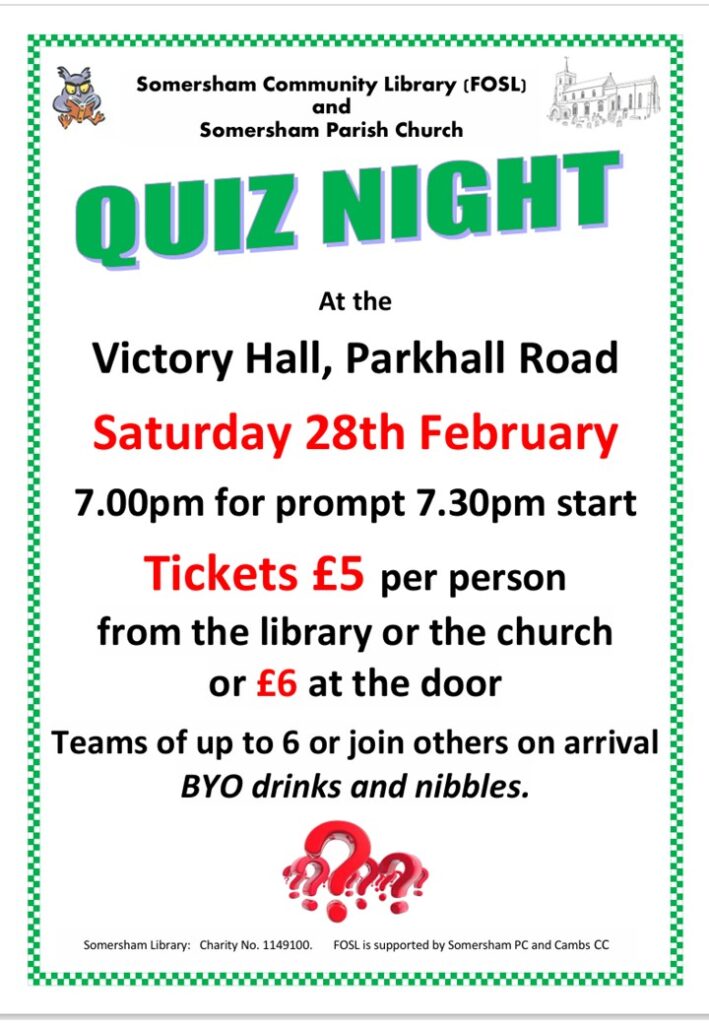 Somersham Community Library is run by the Friends of Somersham Library (FOSL). FOSL is a registered charity # 1149100